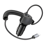 The integrated coiled Lightning cable keeps your setup neat and tangle-free, extending when needed and retracting for easy storage. Paired with a USB port for added flexibility, this charger is perfect for iPhones and other USB-powered devices on the go.