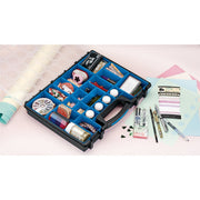 Plastic organiser with an adjustable matrix of lift-out storage compartments. Case has a carrying handle with 'snap fit' closures and clear lid.